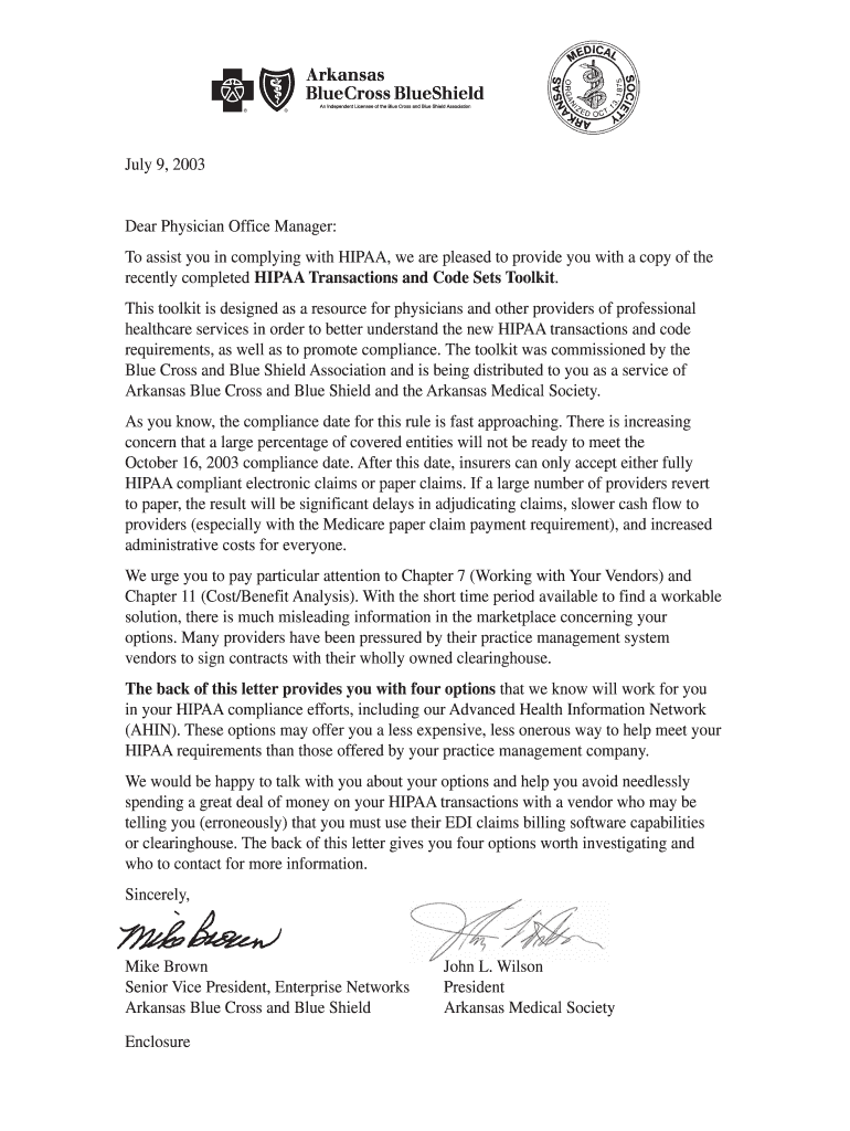 July 9, 2003, Dear Physician Office Manager: To assist you in complying with HIPAA, we are pleased to provide you with a copy of the recently completed HIPAA Transactions and Code Sets Toolkit. This
