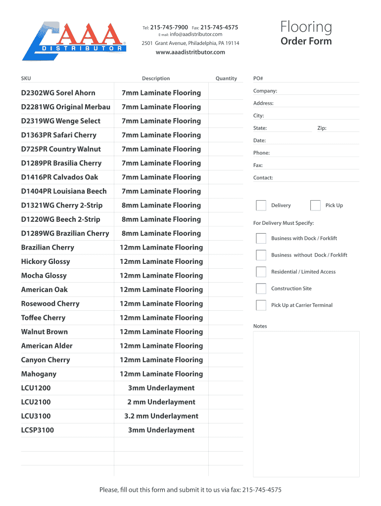 Flooring Tel: 2157457900 Fax: 2157454575 Email: D I S T R I B U T O R SKU info aadistributor.com Order Form 2501 Grant Avenue, Philadelphia, PA 19114 www.aaadistritbutor.com Description Quantity PO#
