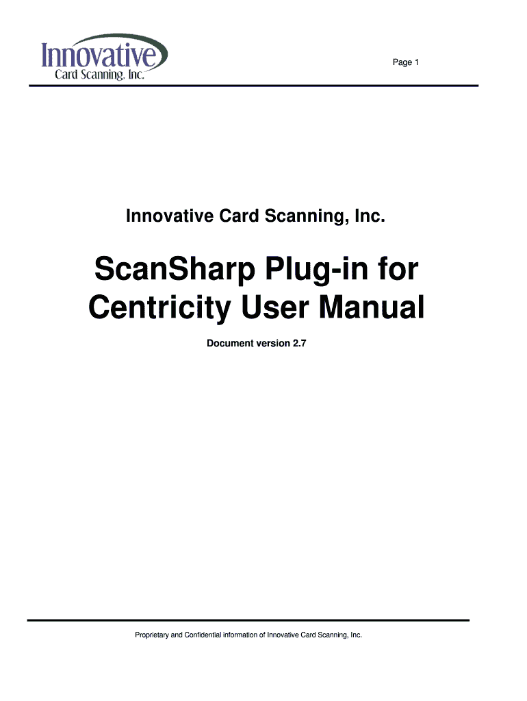 Page 1 Innovative Card Scanning, Inc. Scan Sharp Plug-in for Centricity User Manual Document version 2.7 Proprietary and Confidential information of Innovative Card Scanning, Inc. Page 2 Table of