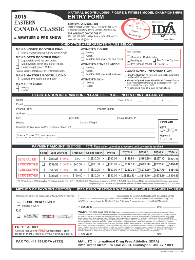 NATURAL BODYBUILDING, FIGURE & FITNESS MODEL CHAMPIONSHIPS 2015 ENTRY FORM EASTERN CANADA CLASSIC MATTER & PRO SHOW Reg Early sister & Save!!! BAFO SATURDAY, OCTOBER 3, 2015, Oscar Peterson Concert
