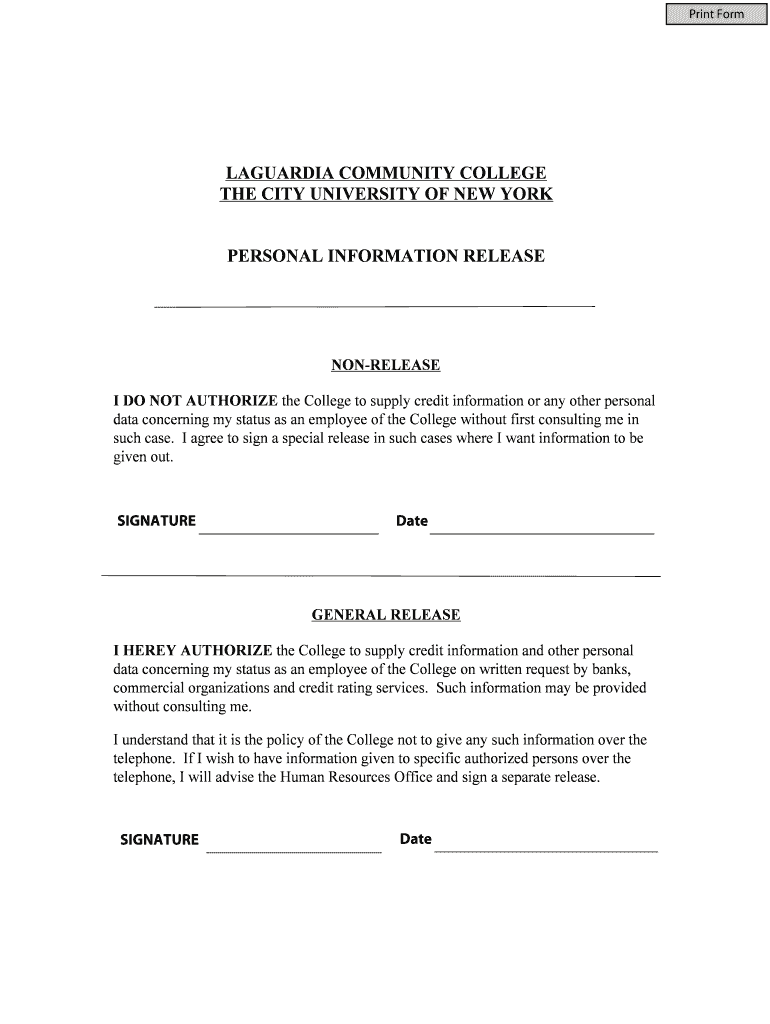 The Personal Information Release Form is intended for employees of LaGuardia Community College who need to authorize or restrict the release of their personal and credit information.