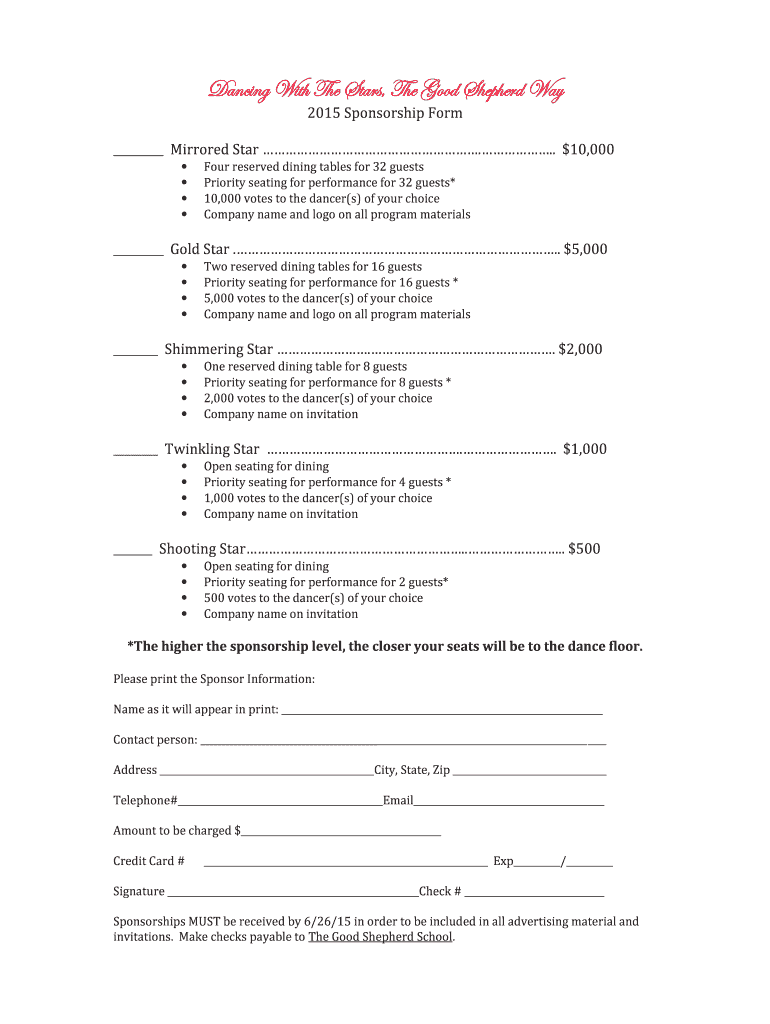2015 Sponsorship Form Dancing With The Stars, The Good Shepherd Way Mirrored Star ... ×10,000 Four reserved dining tables for 32 guests Priority seating for performance for 32 guests* 10,000 votes