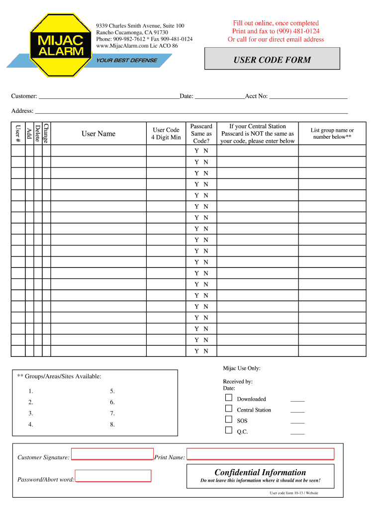 Get the free User code form 8-1-13 Website - Mijac Alarm...