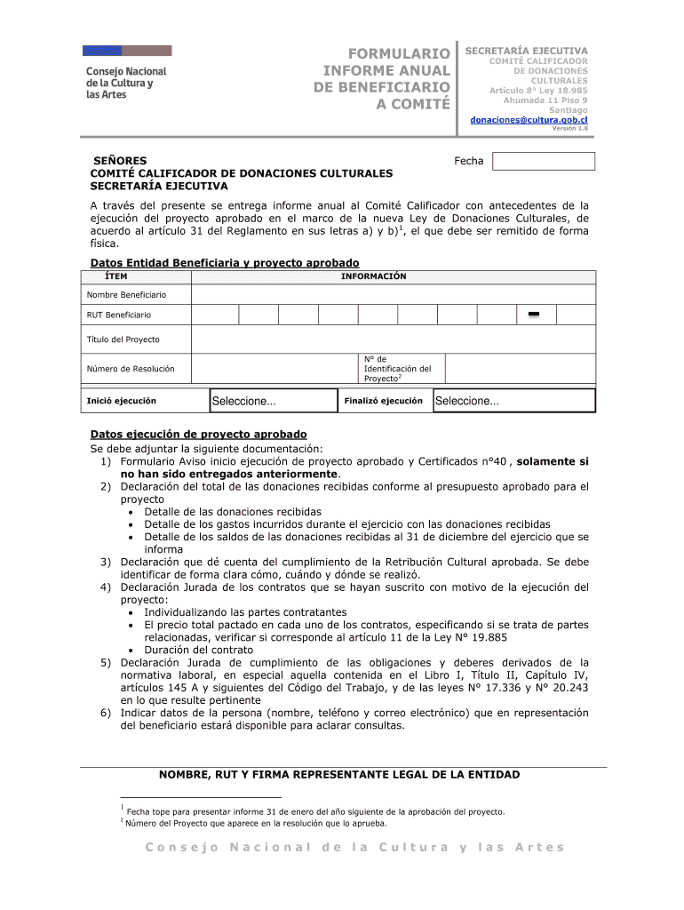 Formulation informed annual DE beneficiaries a comic secretary an executive comic calificador de donations cultural BS art cult 8 Las 18.985