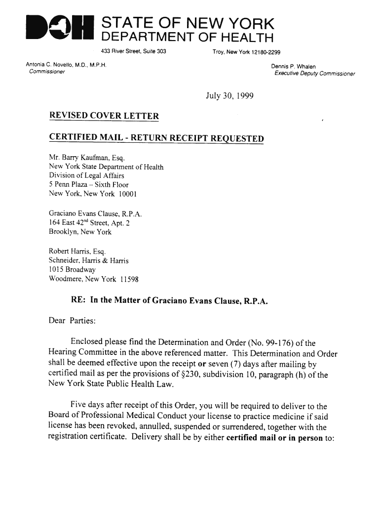 STATE OF NEW YORK DEPARTMENT OF HEALTH 433 River Street, Suite 303 Troy, New York 121802299 Dennis P. Whale Executive Deputy Commissioner Antonia C. Novella, M.D., M.P.H. Commissioner July 30, 1999,