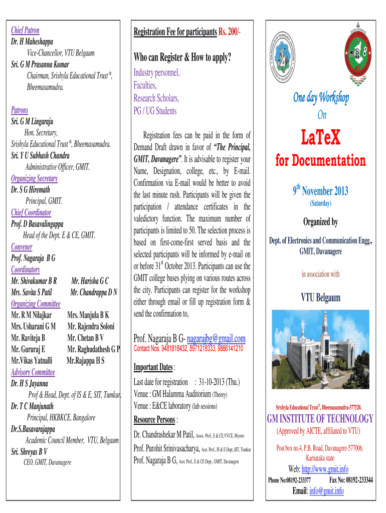 Chief Patron Dr. H Maheshtala ViceChancellor, ITU Belgaum Sri. G M Rosanna Kumar Chairman, Krishna Educational Trust, Bheemasamudra. Patrons Sri. G M Lingaraju Hon. Secretary, Krishna Educational