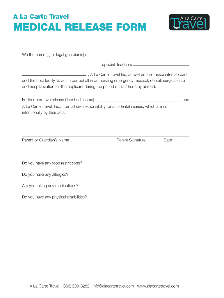 Get the free A La Carte Travel MEDICAL RELEASE FORM