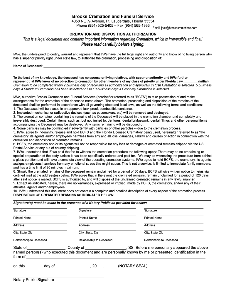 Brooks Cremation and Funeral Service 4058 NE 7th Avenue, Ft. Lauderdale, Florida 33334 Phone (954) 525-5405 Fax (954) 565-1333 CREMATION AND DISPOSITION AUTHORIZATION