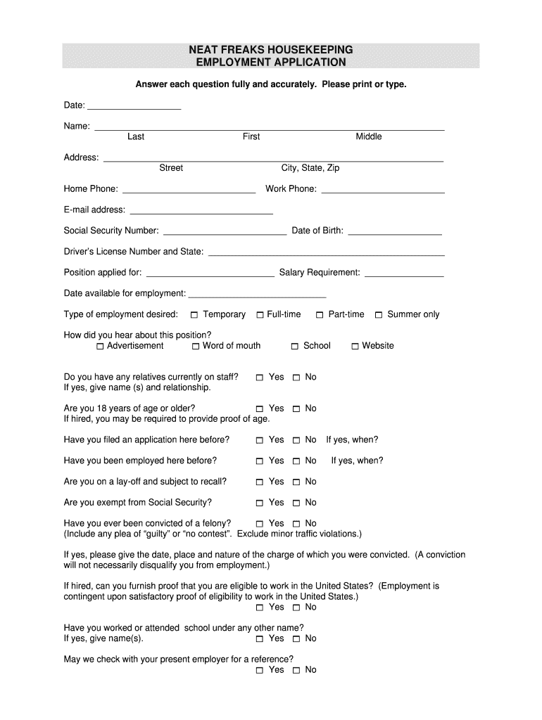NEAT FREAKS HOUSEKEEPING EMPLOYMENT APPLICATION Answer each question fully and accurately. Please print or type. Date: Name: Last First Middle Address: Street City, State, Zip Home Phone: Work Phone:
