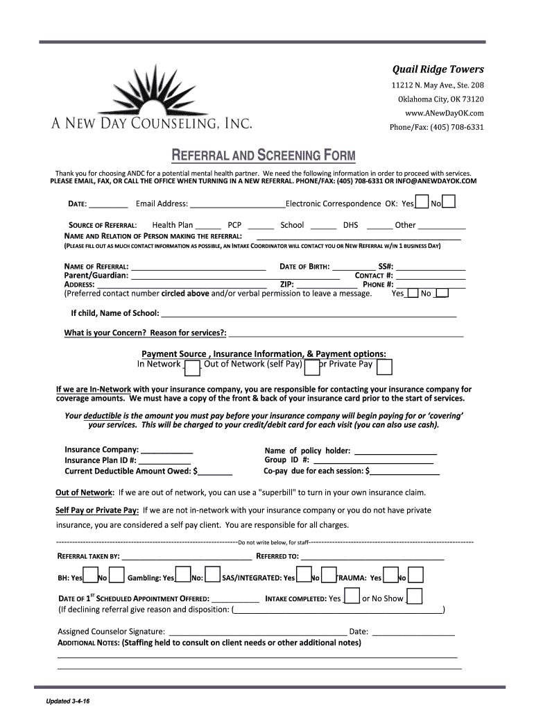 Updated 3-4-16 Quail Ridge Towers 11212 N. May Ave., Ste. 208 Oklahoma City, OK 73120 www.ANewDayOK.com Phone/Fax: (405) 708-6331 REFERRAL AND SCREENING FORM