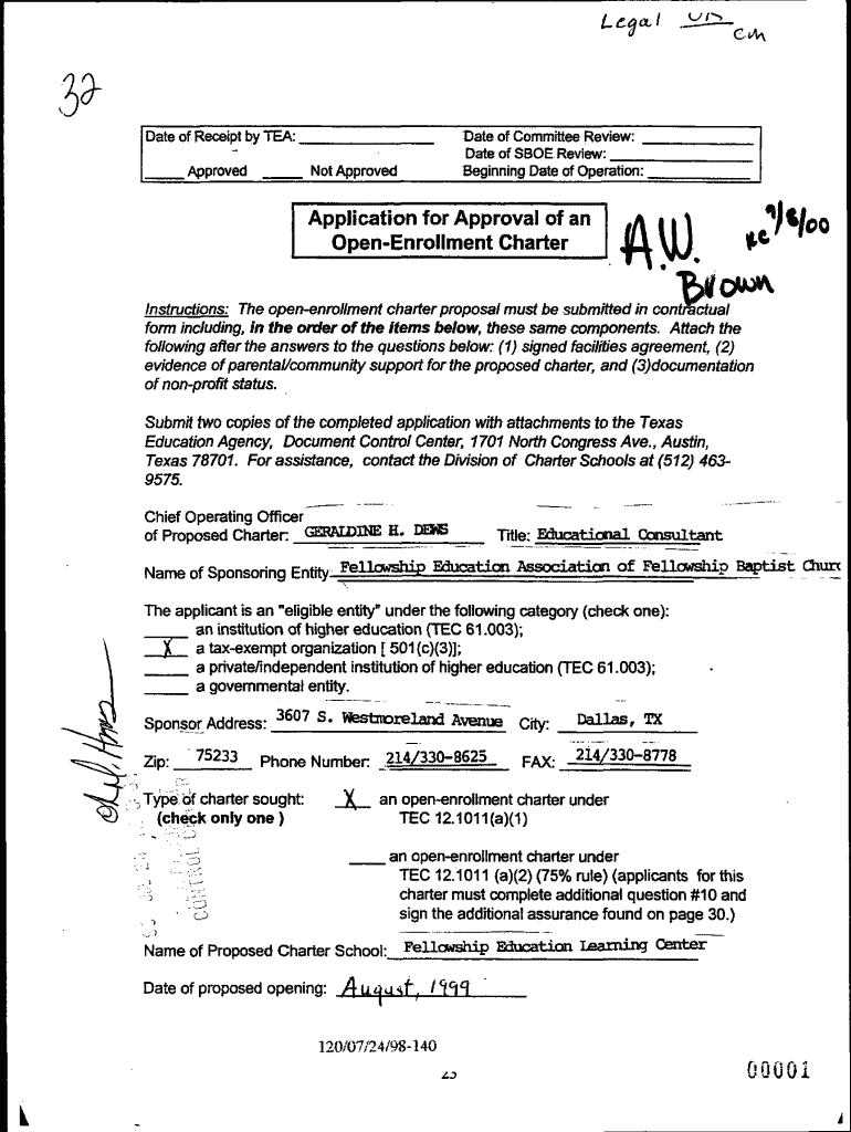 VI Date of Recent by TEA: Approved 'Date of Committee Review: Date of Prereview :: Beginning Date of Ope::;Ra:::ti:::on:.:::. Not ApprovedApplication for Approval of an OpenEnrollment Charter L.........:.