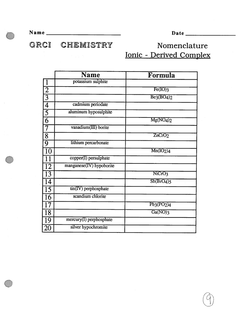 Name Date RCI CHIP IS TRY Ionic Name potassium sulfate Nomenclature Derived Complex Formula Fe(IO)3 j 2jE 3 Be3(B04)2 cadmium period ate aluminum hyposuiphite Mg(NO4) 7 f vanadium(FFL) borate ZnCrO2