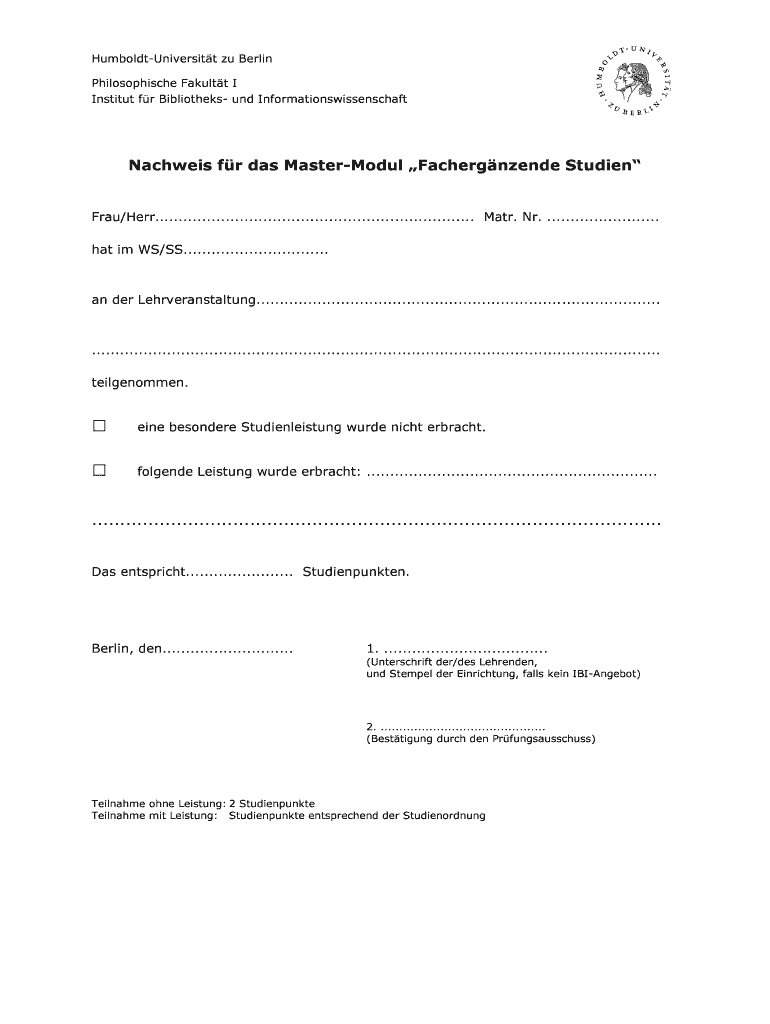 Get the free Nachweis fr das Master-Modul Fachergnzende Studien - ibi hu-berlin