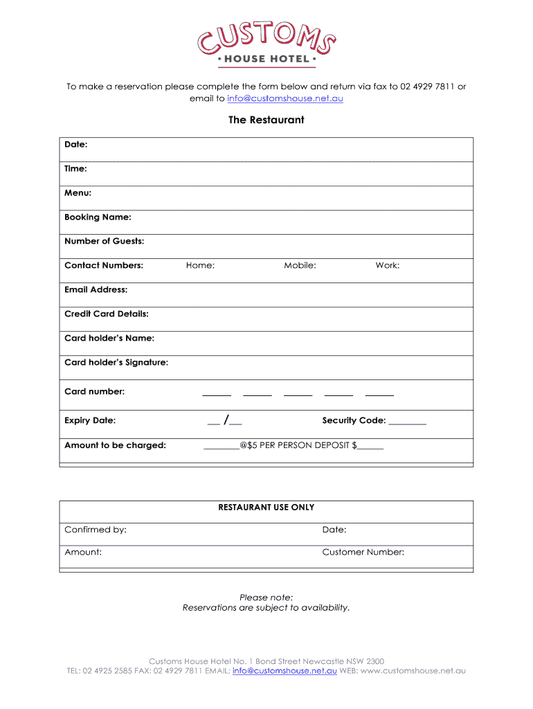 To make a reservation please complete the form below and return via fax to 02 4929 7811 or email to info customhouse.net.AU The Restaurant Date: Time: Menu: Booking Name: Number of Guests: Contact