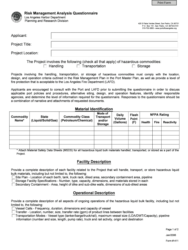 Print Form Risk Management Analysis Questionnaire Los Angeles Harbor Department Planning and Research Division 425 S Palos Verdes Street, San Pedro, CA 90731 P.O. Box 151, San Pedro, CA 907330151
