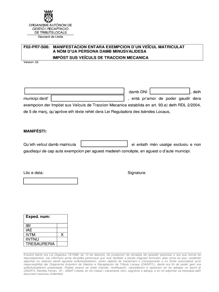 Get the free F02-PR7-S06: MANIFESTACION ENTARA EXEMPCION DUN VECUL ... - oagrtl