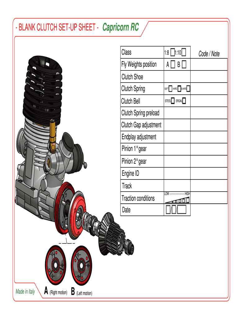 Capricorn RC Made in Italy — BLANK CLUTCH SET-UP SHEET — Fly Weights position Clutch Shoe Clutch Spring preload Clutch Gap adjustment End play adjustment