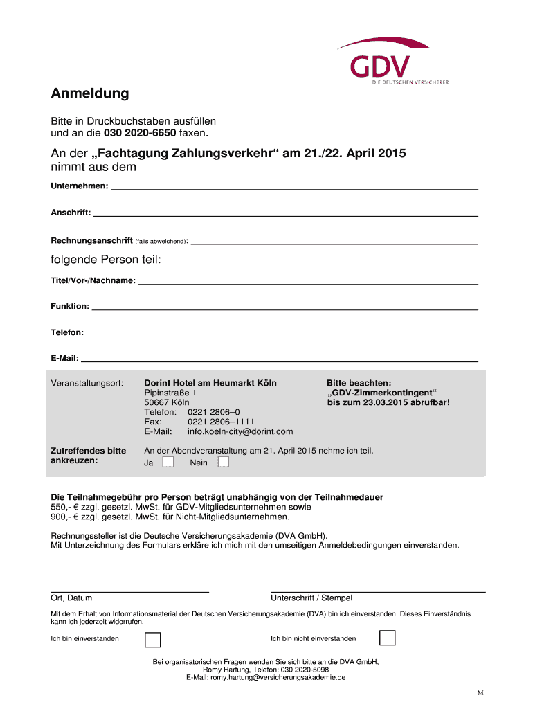 Amending Bitter in Druckbuchstaben USF Allen UND a die 030 2020-6650 faxes. A Fachtagung Zahlungsverkehr am 21./22. April 2015 night AUS them Unternehmen: Antichrist: Rechnungsanschrift (falls attached):