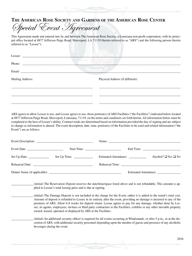 The American Rose Society and Gardens of the American Rose Center Special Event Agreement This Agreement made and entered into by and between The American Rose Society, a Louisiana nonprofit corporation,