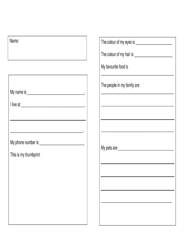 Name: The color of my eyes is The color of my hair is My favorite food is My name is. The people in my family are I live at. My phone number is My pets are This is my thumbprint.