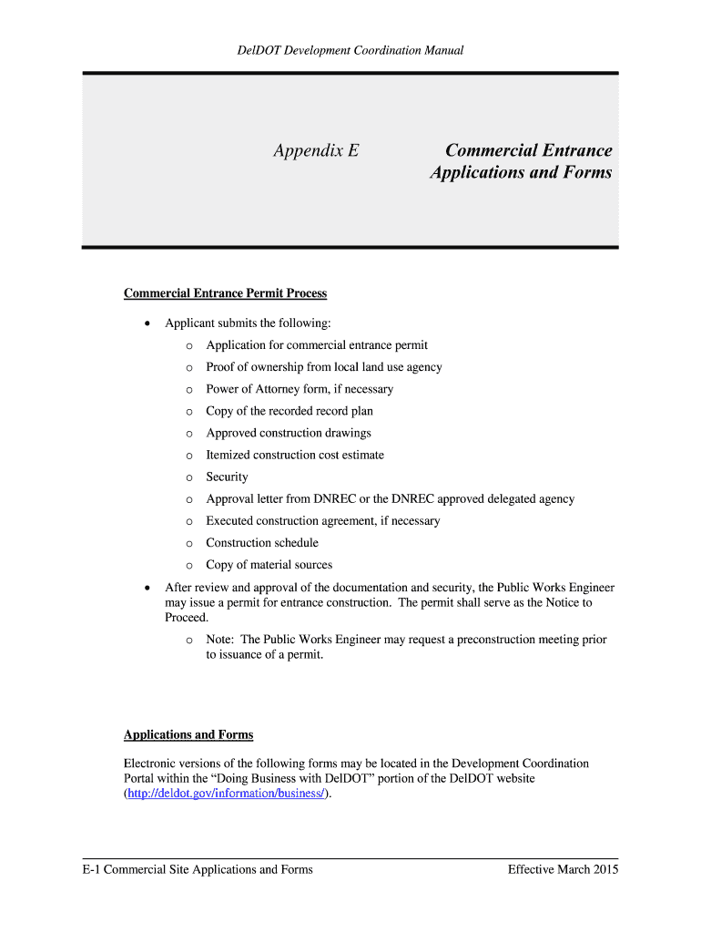 Del DOT Development Coordination Manual Appendix E Commercial Entrance Applications and Forms Commercial Entrance Permit Process Applicant submits the following: o Proof of ownership from local land