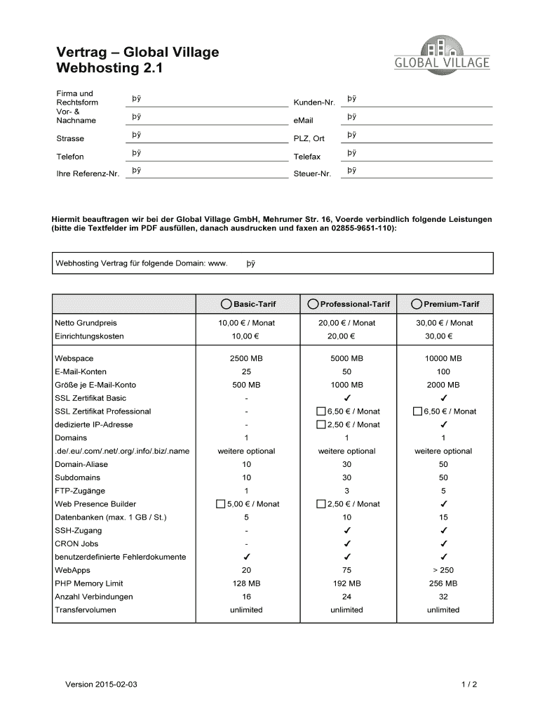 Vert rag Global Village Web hosting 2.1 Firm UND Rechtsform Kunden-Nr. VOR- & Nickname email Stress PLY, ORT Telephone Telefax Ire Referencing. Steering.