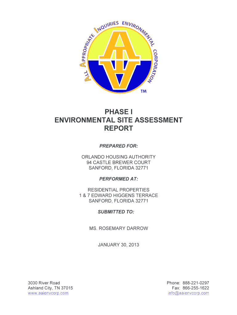 PHASE I ENVIRONMENTAL SITE ASSESSMENT REPORT PREPARED FOR: ORLANDO HOUSING AUTHORITY 94 CASTLE BREWER COURT SANFORD, FLORIDA 32771 PERFORMED AT: RESIDENTIAL PROPERTIES 1 & 7 EDWARD HIGGINS TERRACE