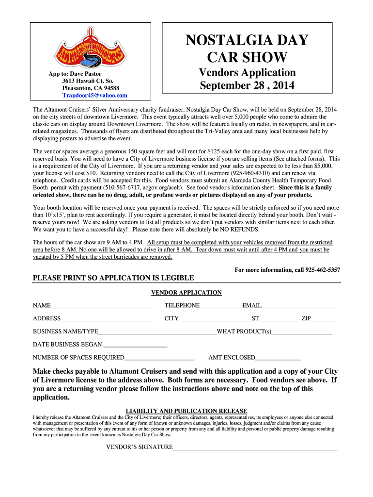 NOSTALGIA DAY CAR SHOW Vendors Application September 28, 2014, App to: Dave Pastor 3613 Hawaii Ct. So. Pleasant on, CA 94588 Trapdoor45 yahoo.com The Lamont Cruisers Silver Anniversary charity fundraiser,