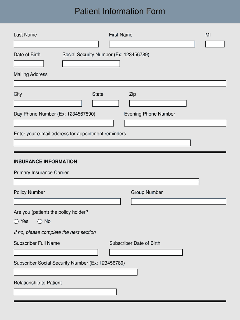 Patient Information Form. Last Name First Name. MI Date of Birth. Social Security Number (Ex: 123456789) Mailing Address. City State. Zip Day Phone Number (Ex ...
