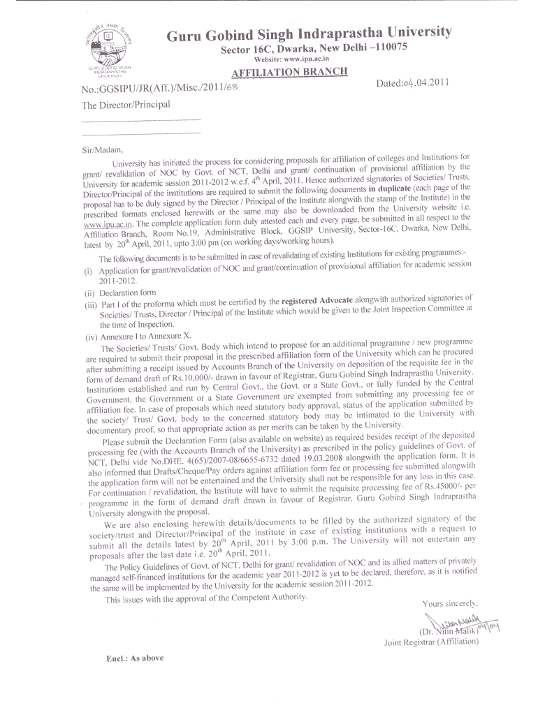 Application for Continuation of Provisional Affiliation by Guru Go bind Singh Indraprastha University (along with declaration form) Academic Session 20112012 All the existing institutions are required
