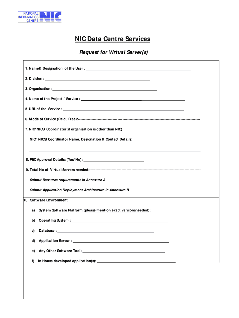 NIC Data Center Services Request for Virtual Server(s) 1. Name Designation of the User : 2. Division : 3. Organization: 4. Name of the Project / Service : 5. URL of the Service : 6. Mode of Service