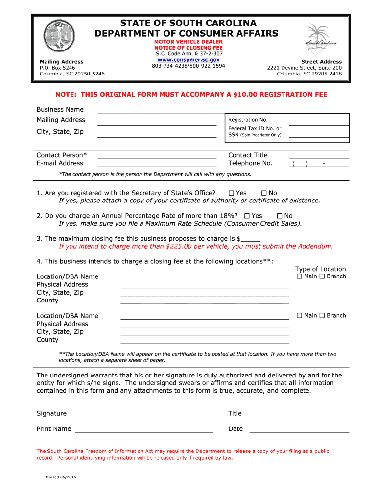 Get the free Notice of Closing Fee Form and Addendum - consumer sc