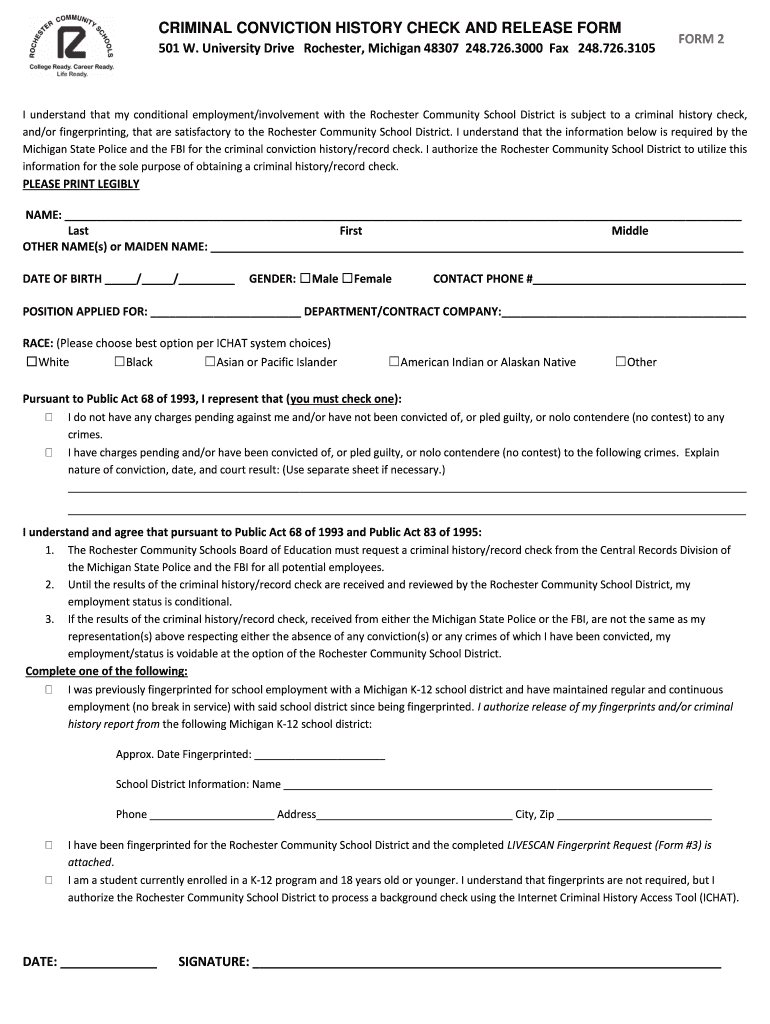 Michigan State Police and the FBI for the criminal conviction history/record check. ... American Indian or Alaskan Native ... I was previously fingerprinted for school employment with a Michigan K-12