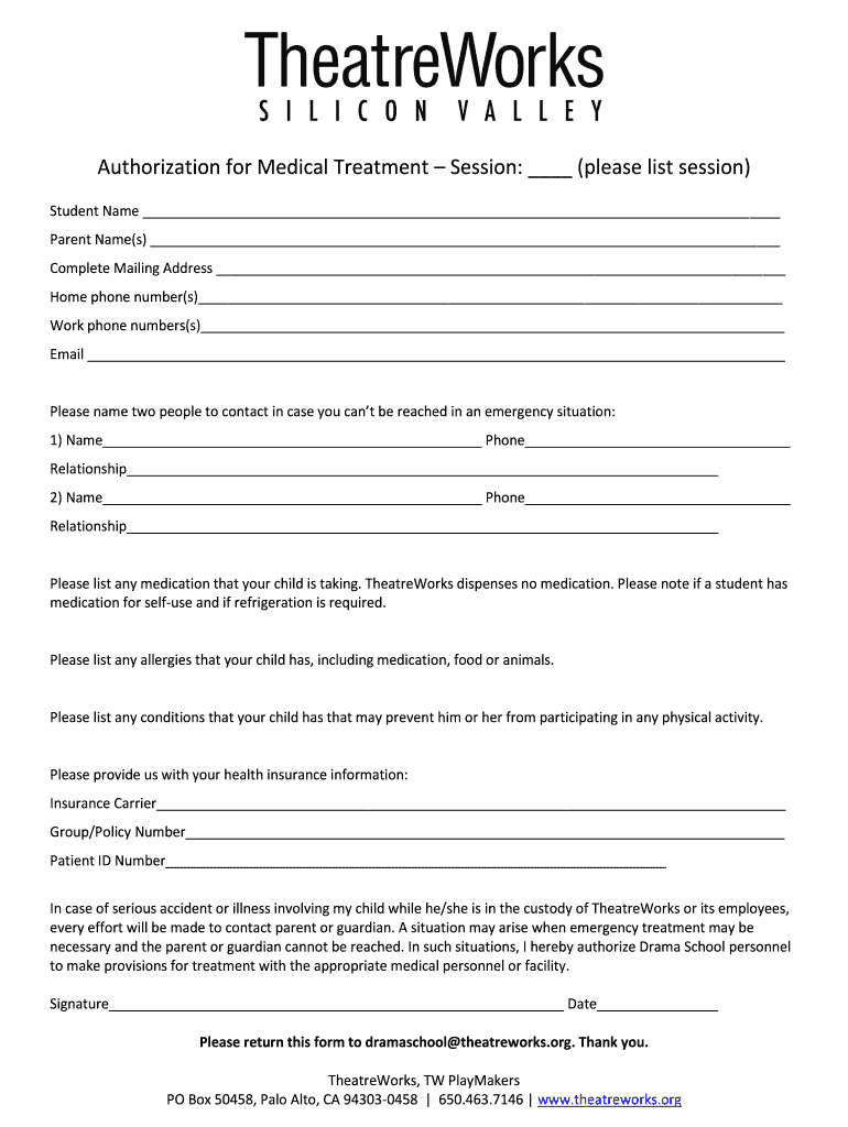 Authorization for Medical Treatment Session: (please list session) Student Name Parent Name(s) Complete Mailing Address Home phone number(s) Work phone numbers(s) Email Please name two people to contact
