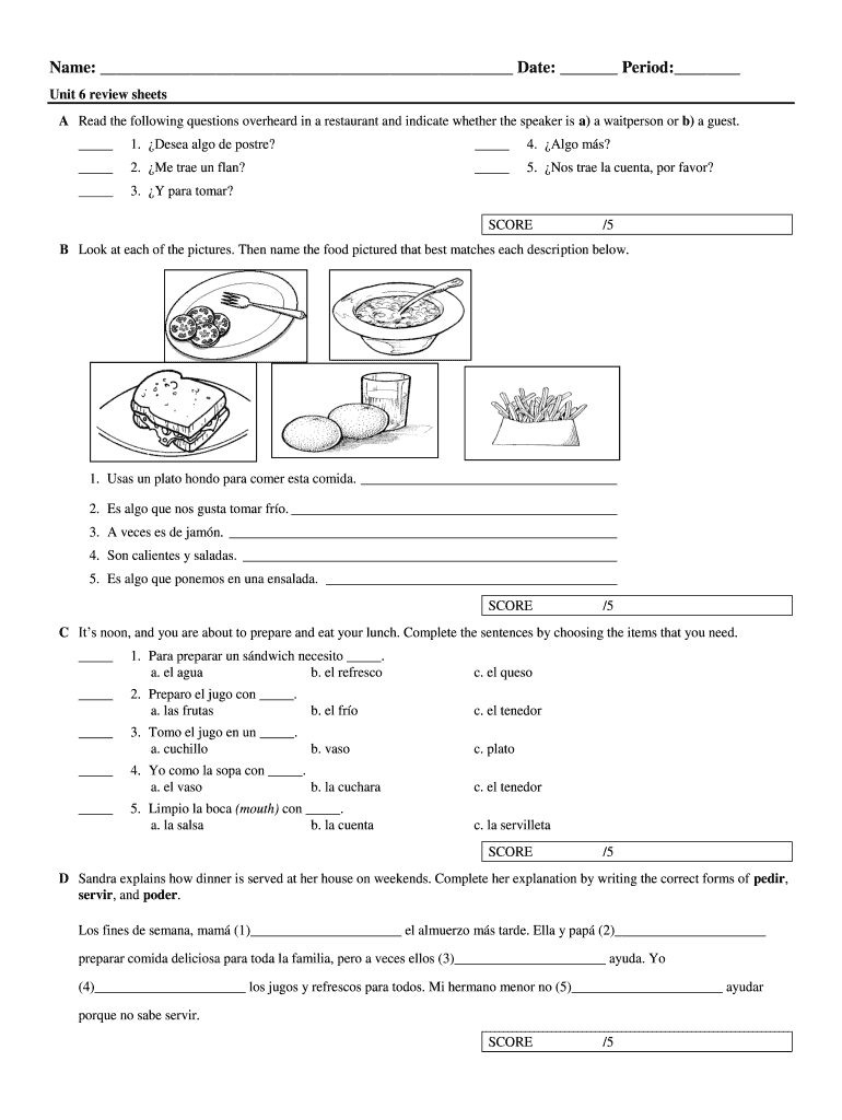 Name: Date: Period: Unit 6 review sheets A Read the following questions overheard in a restaurant and indicate whether the speaker is a) a waitperson or b) a guest. 1. DESE also DE poster? 4. Also,