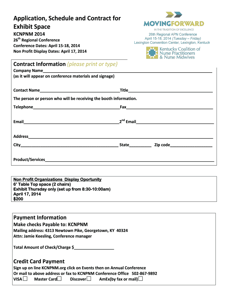 Application, Schedule and Contract for Exhibit Space CNPN 2014 26th Regional Conference Dates: April 15-18, 2014 Non Profit Display Dates: April 17, 2014, Contract Information (please print or type)