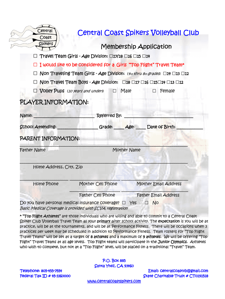 Central Coast Spiders Volleyball Club Membership Application Travel Team Girls Age Division: 17/18 16 15 14 17/18 I would like to be considered for a Girls Top Flight Travel Team* Non-Traveling Team
