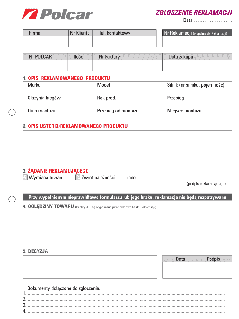 ZG?SCENE REKLAMACJI Data. Firm NR Client Tel. Kontaktowy NR Reklamacji (type?NIA dz. Reklamacji) NR POLAR Ill?? NR Factory Data makeup.