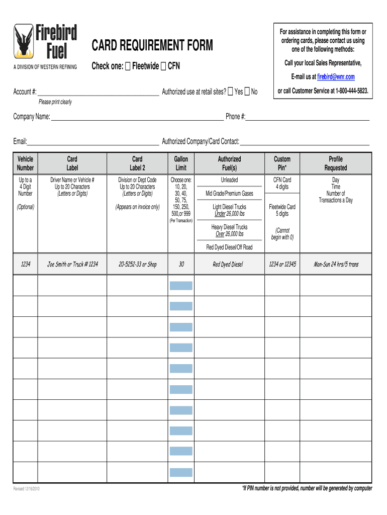 Revised 12/ 16/2010 *If PIN is not provided, number will be generated by computer CARD REQUIREMENT FORM Check one: Fleet wide CFN Account ...