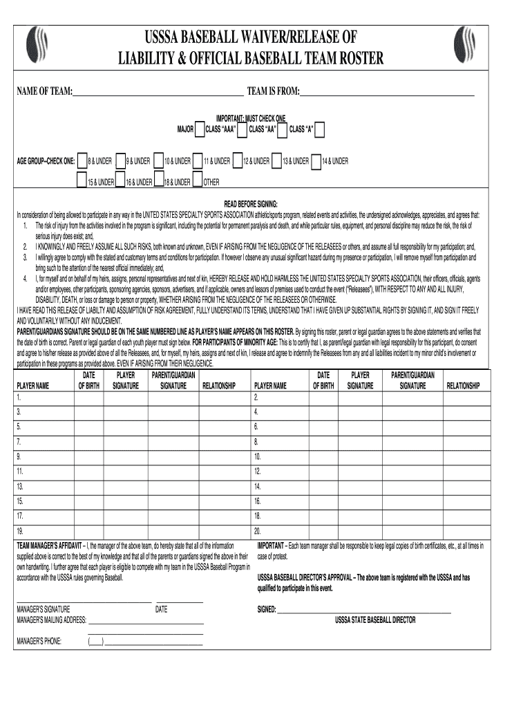 Remember that the specifics of who needs a USSSA baseball waiver/release form may vary depending on the organization or league rules, so always check with the appropriate authorities to ensure compliance.