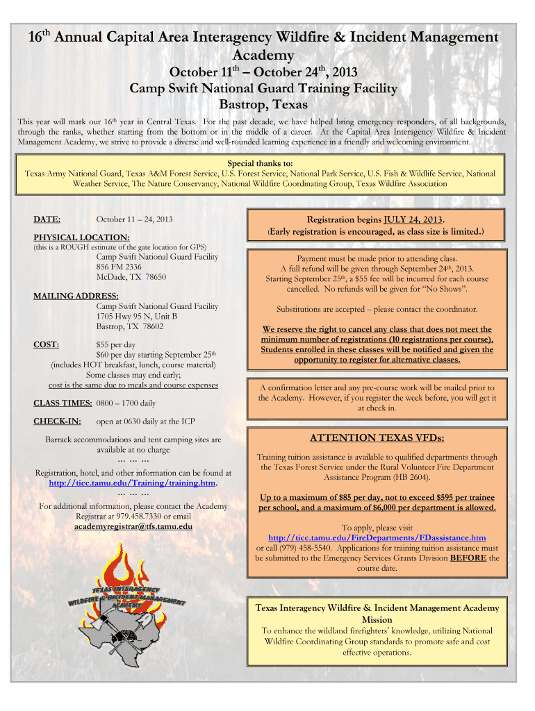 16th Annual Capital Area Interagency Wildfire & Incident Management Academy October 11th October 24th, 2013 Camp Swift National Guard Training Facility Bastrop, Texas This year will mark our 16th
