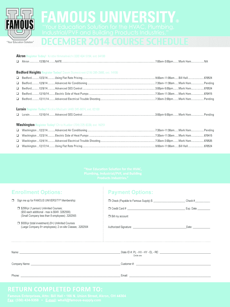 U FAMOUS Your Education Solution FAMOUS UNIVERSITY Your Education Solution for the HVAC, Plumbing, Industrial/PDF and Building Products Industries. DECEMBER 2014 COURSE SCHEDULE Akron Register Today!
