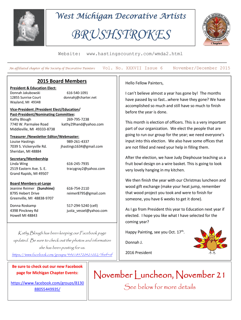 West Michigan Decorative Artists BRUSHSTROKES Website: www.hastingscountry.com/wmda2.html An affiliated chapter of the Society of Decorative Painters Vol. No. XXXVII Issue 6 2015 Board Members President