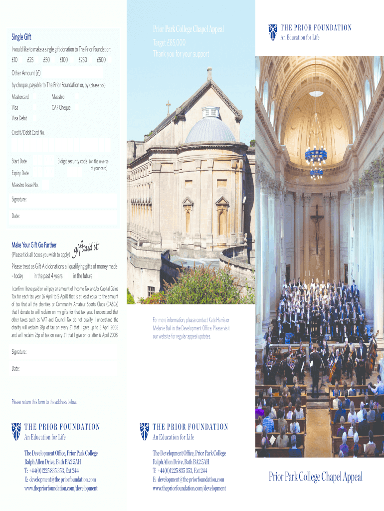 Single Gift I would like to make a single gift donation to The Prior Foundation: 10 25 50 100 250 500 Prior Park College Chapel Appeal Target 85,000 Thank you for your support Other Amount () by check,