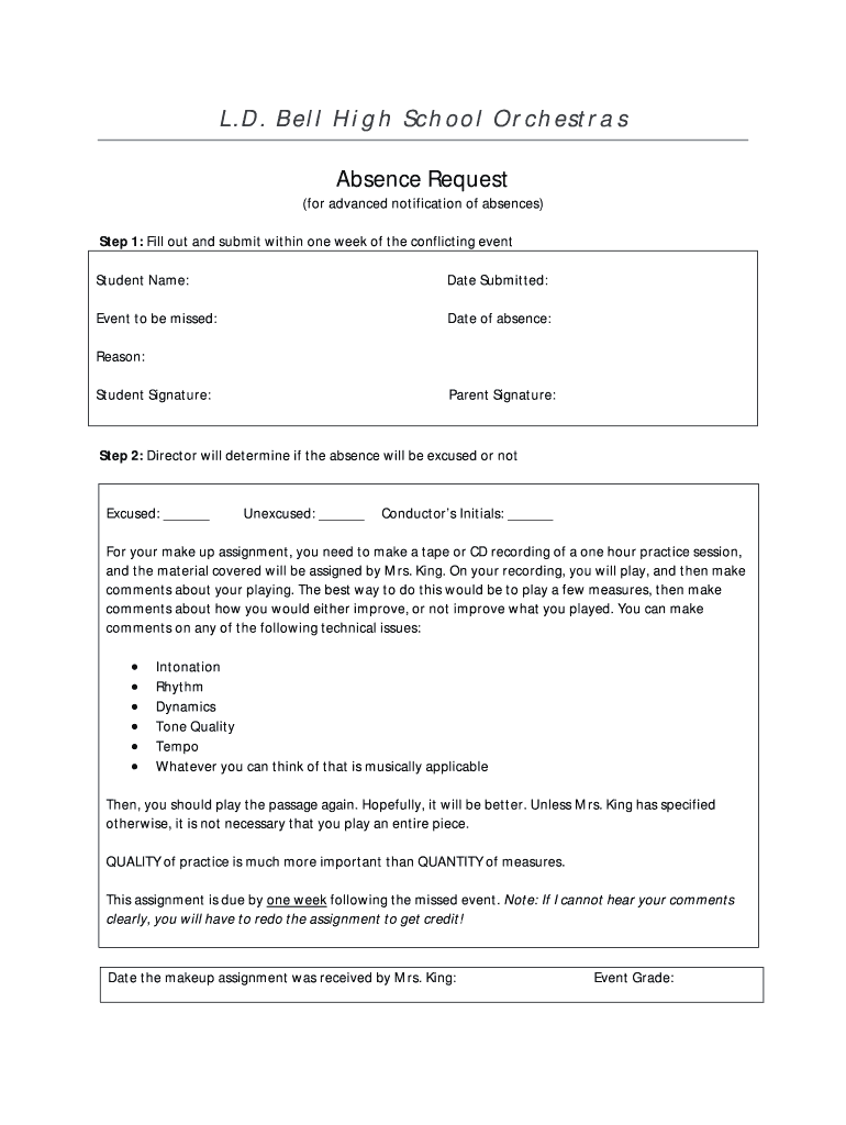 L.D. Bell High School Orchestras Absence Request (for advanced notification of absences) Step 1: Fill out and submit within one week of the conflicting event Student Name: Date Submitted: Event to