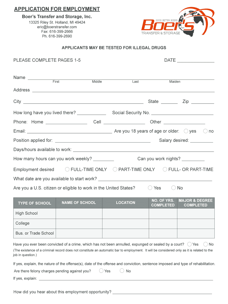 Get the free APPLICATION FOR EMPLOYMENT - Boer's Transfer and Storage