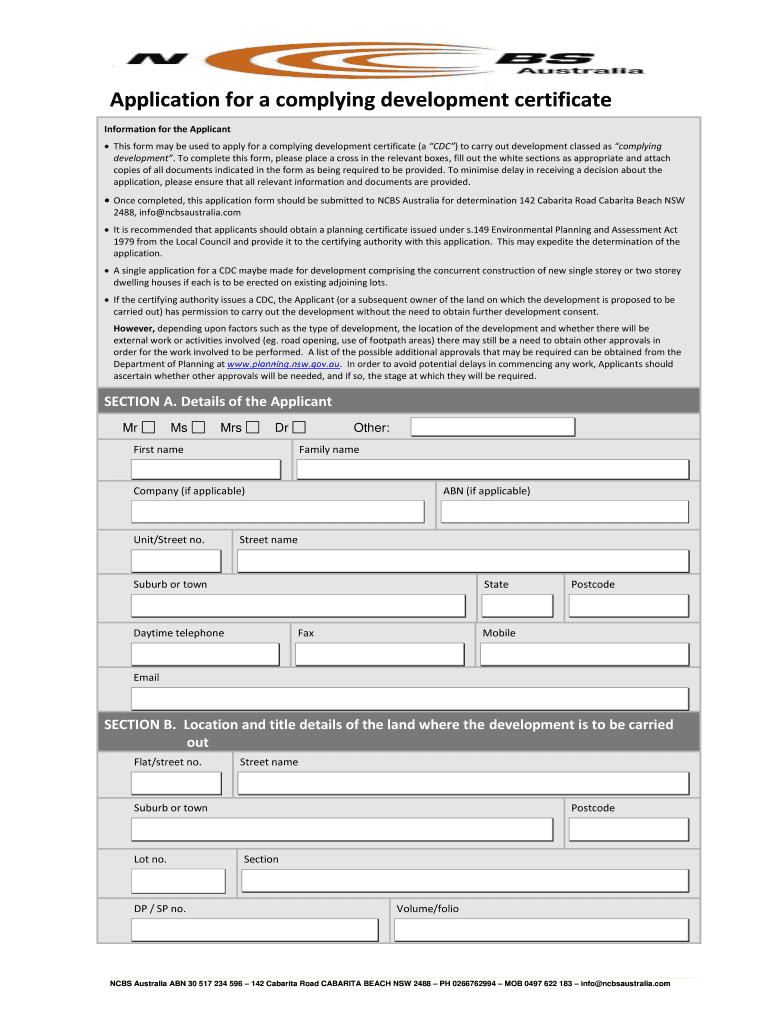Application for a complying development certificate Information for the Applicant This form may be used to apply for a complying development certificate (a CDC) to carry out development classed as