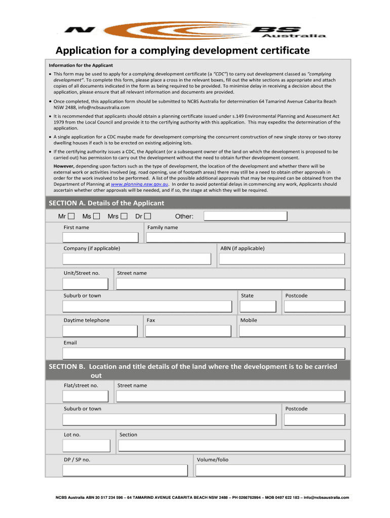 Application for a complying development certificate Information for the Applicant This form may be used to apply for a complying development certificate (a CDC) to carry out development classed as