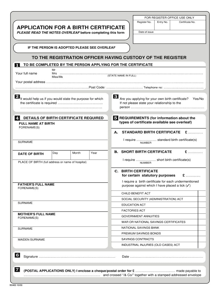 FOR REGISTER OFFICE USE ONLY Register No. Entry No. Certificate No. APPLICATION FOR A BIRTH CERTIFICATE PLEASE READ THE NOTES OVERLEAF before completing this form Date of issue IF THE PERSON IS ADOPTED