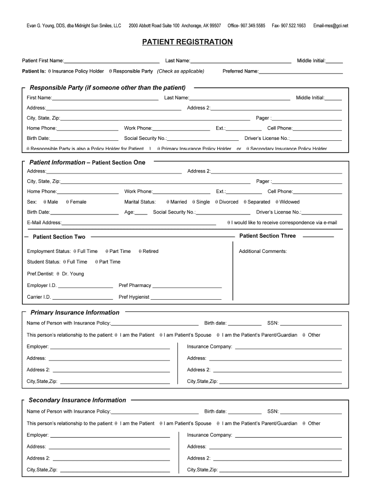 Evan G. Young, DDS, DBA Midnight Sun Smiles, LLC 2000 Abbott Road Suite 100 Anchorage, AK 99507 Office 907.349.5585 Fax 907.522.1663 Emails GCI.net PATIENT REGISTRATION Patient First Name: Last Name: